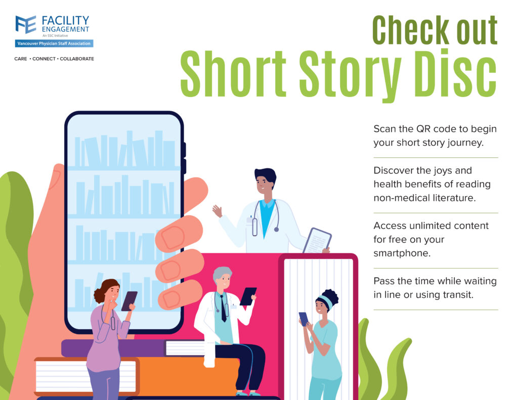 Once upon a time (recently, actually), VPSA’s Community Building & Wellness (CB&W) Task Group approved funding for Short Story Disc, a digital service from which VMDAS members can download unlimited content for free on their smartphone and take story reading to a whole new level. The service offers bites of literature in one-, three- or five-minute reading times. There’s access to thousands of fiction and creative non-fiction works written by writers worldwide, in the form of short stories, poetry, and comics. You can access Short Story Disc content via a QR code on display in the VMDAS Hub for Engagement and Wellness at VGH.