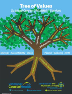 Spiritual Care and Multi-Faith Services has created its own tree of values, which is based on VCH’s values (caring for everyone; always learning; and striving for results). Components include strategy, accountability, vision, passion, guidance, and mirth, while its branches represent compassion, curiosity, and collaboration and everything that follows from those.